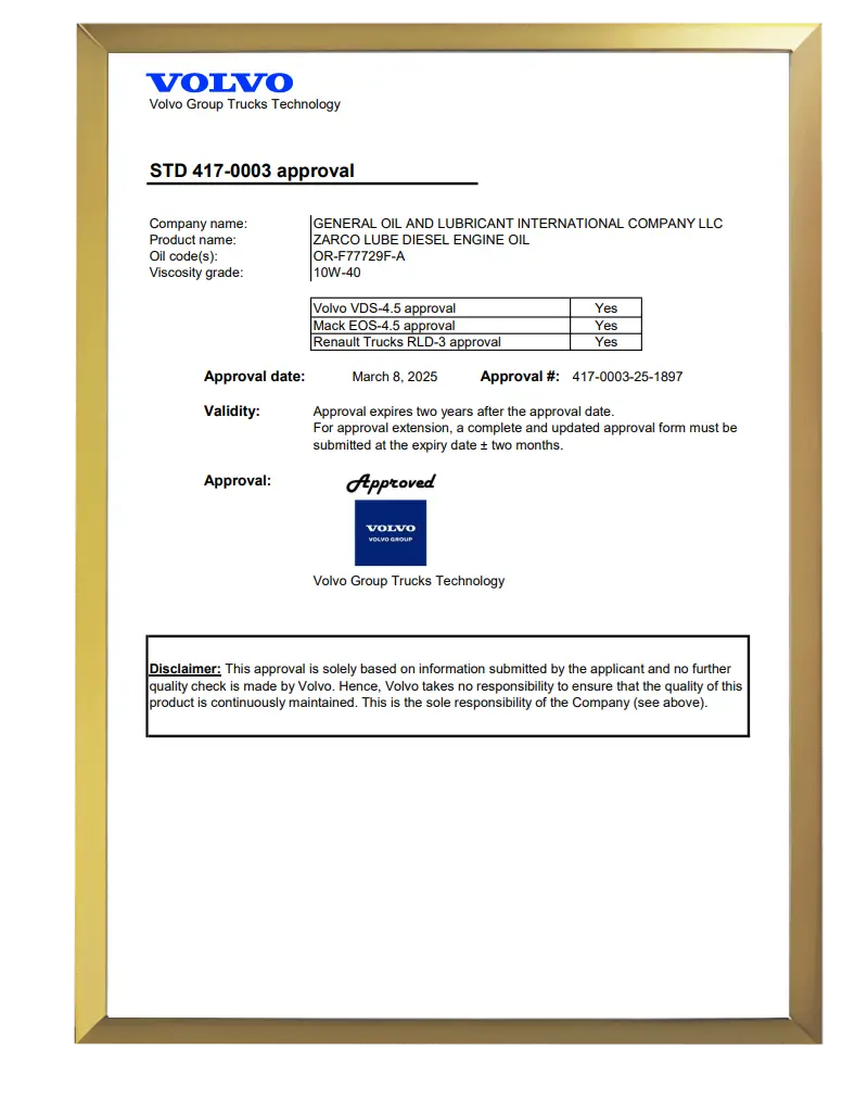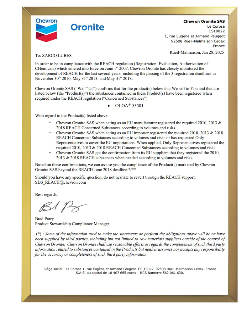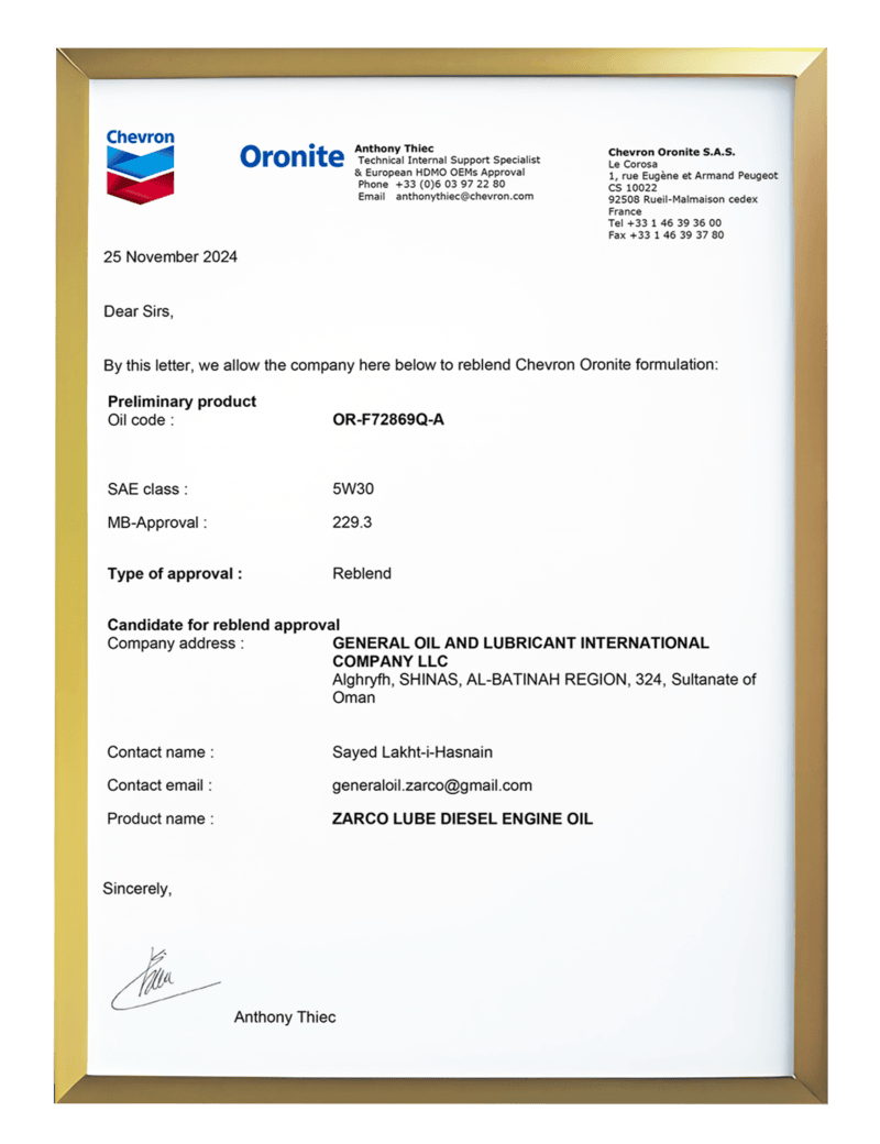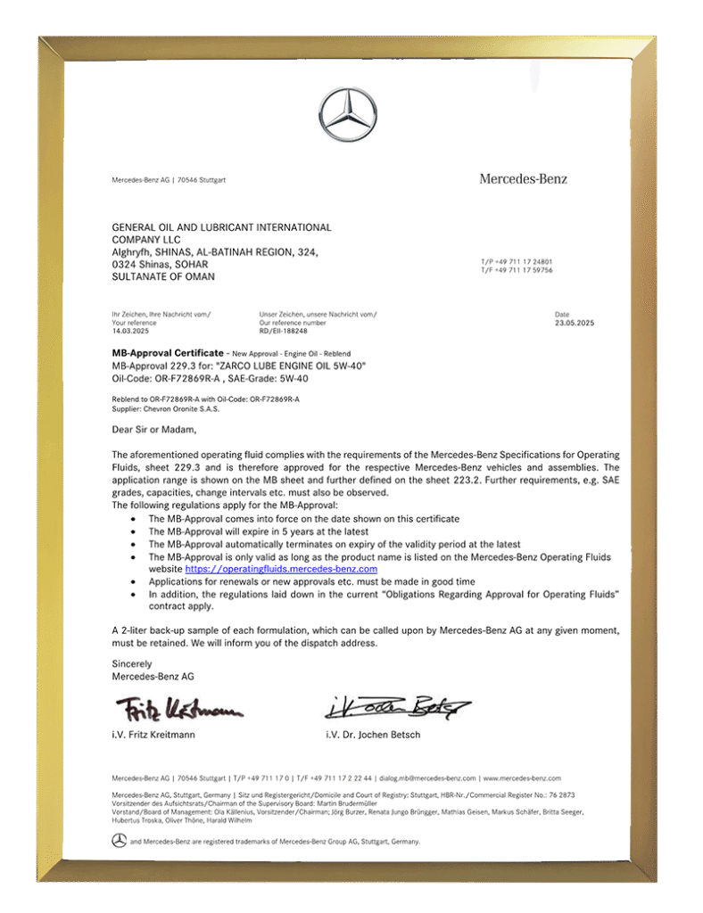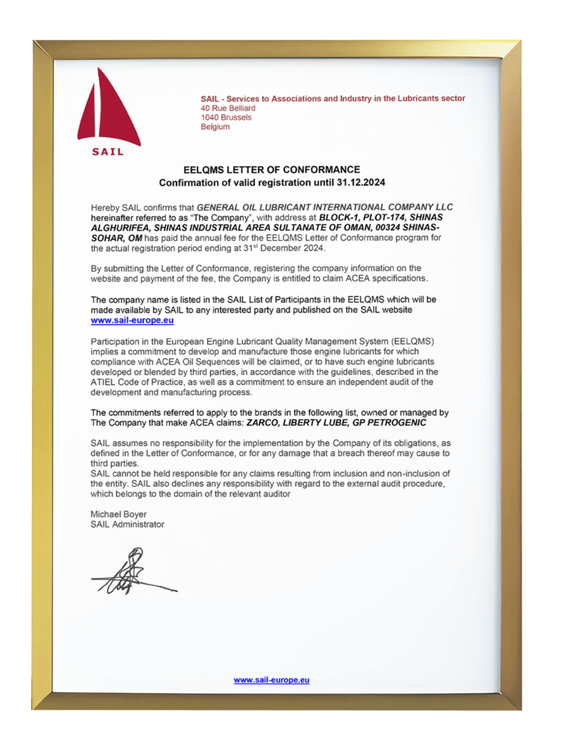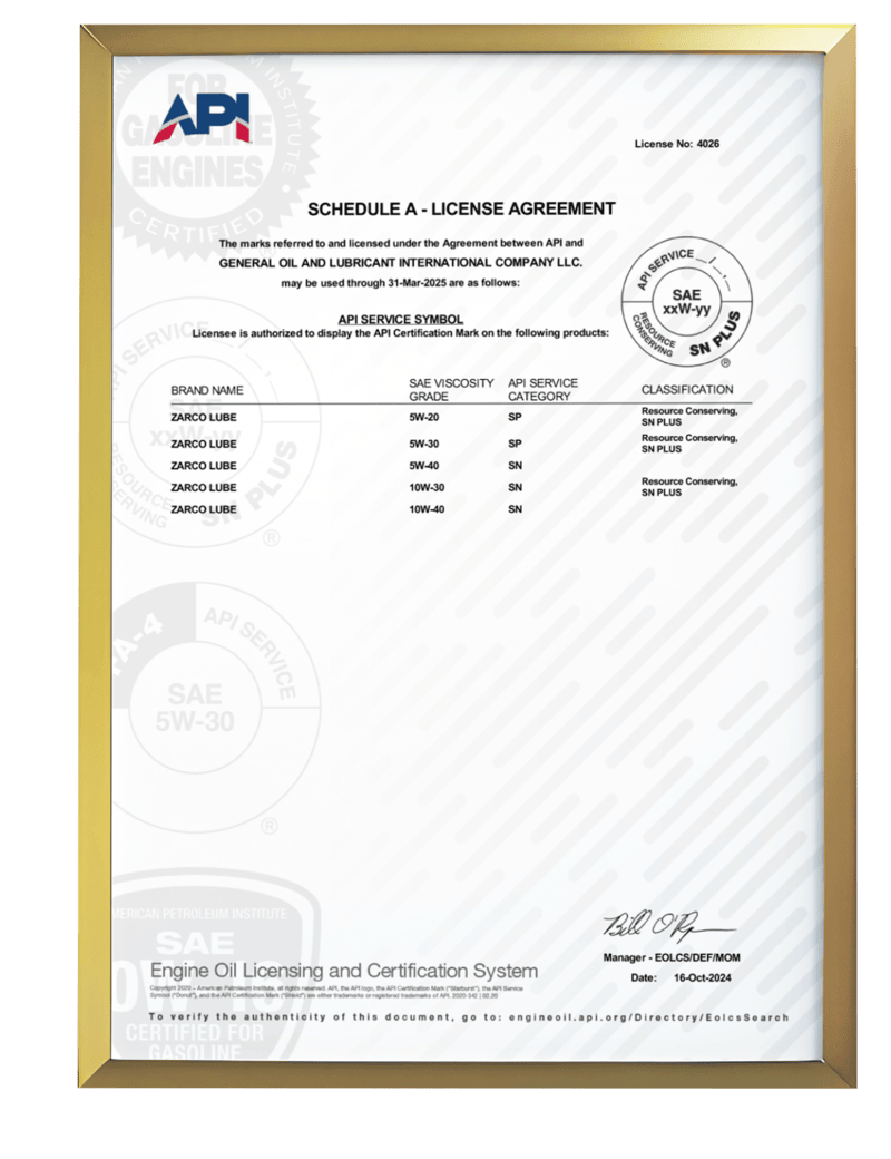 I prodotti ZARCO Lube sono supportati da una serie di prestigiose certificazioni, che ne garantiscono la qualità e l’affidabilità superiori. Ogni prodotto viene sottoposto a rigorosi test e soddisfa gli standard internazionali di settore, offrendo ai clienti la tranquillità di utilizzare oli e lubrificanti performanti e sicuri per i loro motori. Grazie alle certificazioni dei principali enti normativi, ZARCO Lube garantisce una protezione eccezionale, una maggiore efficienza e una lunga durata per tutti i tipi di veicoli/macchinari, offrendo prestazioni ineguagliabili. Queste certificazioni riflettono il nostro impegno per l’eccellenza e l’innovazione continua nel fornire soluzioni di alta qualità per la cura del motore.